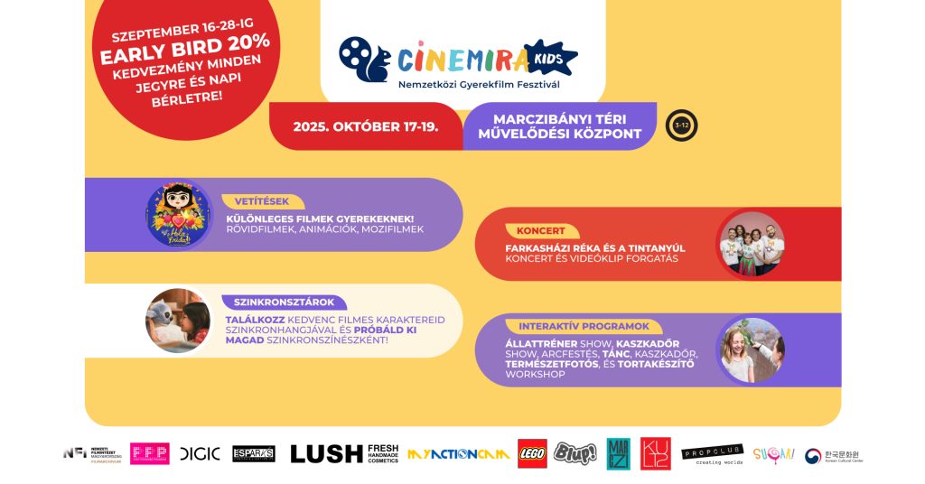 На единственном в Венгрии кинофестивале для детей и молодежи участников ждут специальные подборки короткометражек, отмеченные наградами работы и интерактивные программы. Исключительным событием станет показ на большом экране культового фильма Дэвида Линча Twin Peaks – Огонь, иди со мной!, новой работы Мишеля Гондри, а также анимационной ленты о жизни Фриды Кало. Зрители также смогут встретиться с двумя венгерскими режиссёрами — обладателями премии «Оскар».