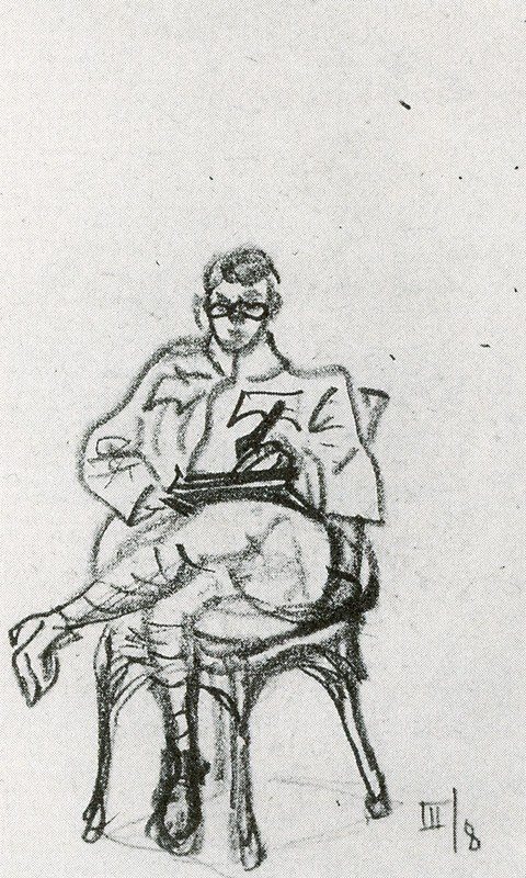 Одна из первых известных работ Мохой-Надя, созданная во время его службы артиллерийским наблюдателем в годы Первой мировой войны. Этот автопортрет часть серии карандашных рисунков, выполненных на официальных полевых открытках. Художник изображает себя в спокойной позе, сдержанно и внимательно. Это уже время, когда он выздоравливал в будапештских госпиталях и работал как инструктор, активно общаясь с другими художниками.