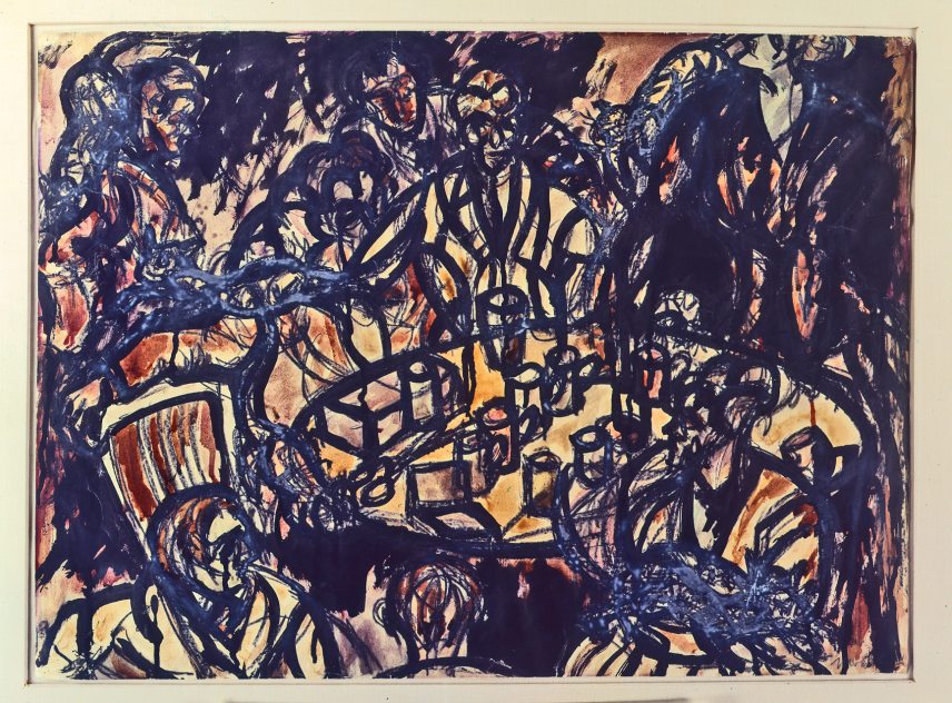 Эта акварель относится к раннему периоду, когда Мохой-Надь создавал сложные композиции, построенные на переплетающихся, почти абстрактных линиях. За завихрениями едва угадывается сцена: несколько фигур сидят за столом с бокалами и предметами. В воздухе напряжение, фон написан экспрессивно, с пятнами туши и рваными мазками.